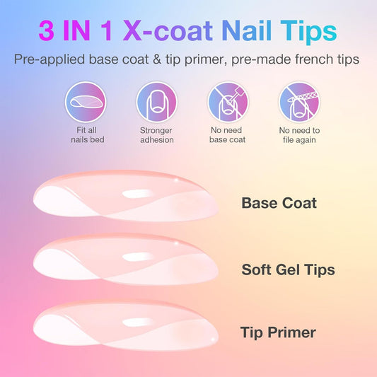 French Gel Nail Tips, 150PCS Short Almond Press on Nails, 3 in 1 X-Coat Soft Gel Nail Tips, Nude French Tip Press on Nails with Pre-Applied Tip Primer & Base Coat, 15 Sizes of Nail Art DIY